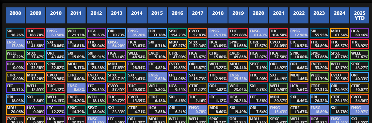 • المؤشرات المالية: أظهرت شركة Ensign تاريخيًا نموًا قويًا في الإيرادات، مدعومًا بالنمو العضوي والعمليات الاستحواذ الانتقائية على المؤسسات غير الفعالة. تتكون إيرادات الشركة في الغالب من دافعي الضرائب الحكوميين مثل Medicare وMedicaid، بالإضافة إلى مصادر الدفع الخاصة. يجب على المستثمرين مراقبة المؤشرات المالية مثل EBITDA ومعدل الإشغال، والتي تعد مؤشرات حاسمة للكفاءة التشغيلية.