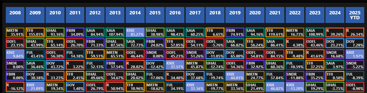 • تظهر Knight-Swift نمواً ثابتاً في الإيرادات، مدفوعاً بالطلب العالي في صناعة النقل، مستفيدة من سوق النقل المناسب وزيادة النشاط في التجارة الإلكترونية.