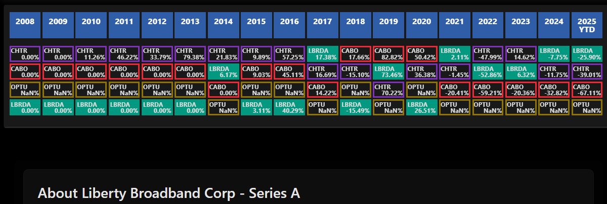 • Обзор компании: LBRDA представляет компанию Liberty Broadband Corporation, которая в основном занимается телекоммуникациями и медиа-сектором. Она владеет значительными долями в Charter Communications, ведущем поставщике широкополосных услуг, и участвует в других проектах в области медиа.